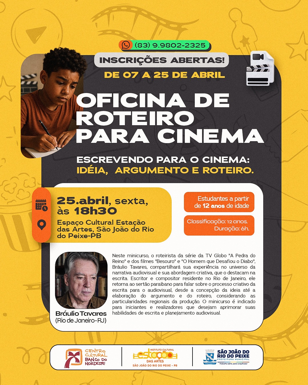 A oficina será ministrada pelo roteirista de cinema Bráulio Tavares (Rio de Janeiro-RJ) e será realizada no dia 25 de abril de 2025, sexta, às 18h30 no Espaço Cultural Estação das Artes.