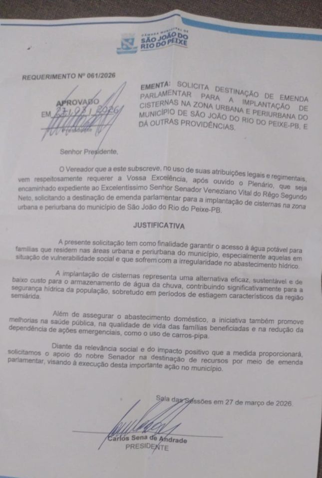 O vereador e presidente da Câmara Municipal de São João do Rio do Peixe, Carlos Medeiros, solicitou a destinação de emenda parlamentar para a implantação de cisternas na zona urbana e periurbana do município.